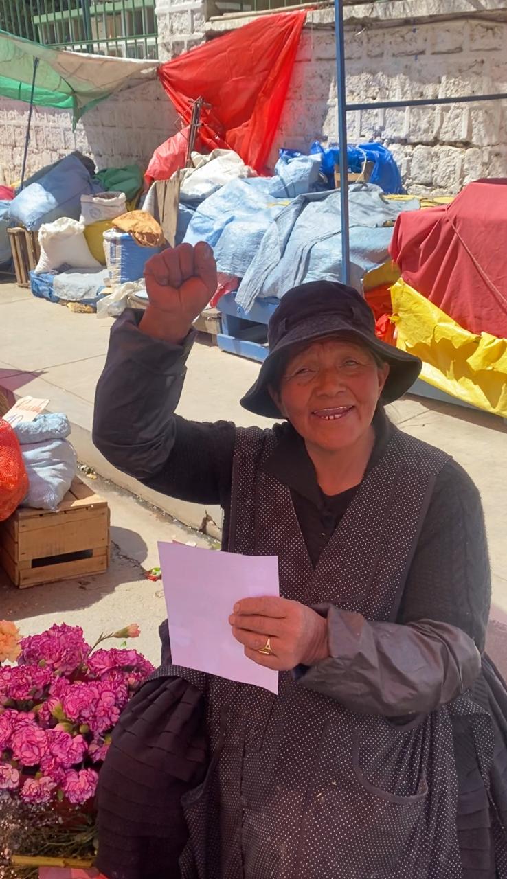 Al recibir la propaganda electoral, Joseja no pudo contener su emoción. Una sonrisa esperanzadora iluminó su rostro y, con una voz llena de convicción, comenzó a cantar: «¡Laralaralaralara!! ¡Laralaralara! ¡Va ganar!» Su compañera de venta se sumó de inmediato a la celebración, compartiendo el palpable beneplácito por la visita y el material entregado.