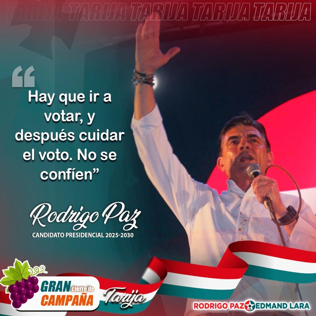 Prensa(PR). Tarija 15 de octubre de 2025.En un cierre de campaña cargado de energía, Rodrigo Paz Pereira pidió a los bolivianos “defender la democracia con el voto y con el corazón”.Ante una multitud reunida en Tarija, el candidato presidencial advirtió que existen fuerzas que intentan impedir el cambio que el país necesita.“Hay que ir a votar y cuidar el voto, porque cuando uno se va a su casa ya no sabe qué pasa en esa mesa. No se confíen”, afirmó con firmeza.Paz sostuvo que el proceso electoral representa una decisión histórica para Bolivia y llamó a la ciudadanía a participar masivamente el 19 de octubre.“Sin democracia no cambiamos la historia de la patria”, dijo, destacando que la voluntad del pueblo será la que determine el futuro del país.Recordó además que confía en el Tribunal Supremo Electoral, pero insistió en la vigilancia ciudadana.Desde el sur del país, Paz cerró su mensaje con un tono esperanzador:“Cuidemos el voto, porque está en nuestras manos construir el nuevo destino de Bolivia”. Navegación de entradas Entrada anteriorAnterior Rodrigo Paz desde la tierra chapaca: «No estamos cerrando una campaña, estamos abriendo la ruta hacia la victoria”Siguiente entradaSiguiente Paz invita a la juventud y los emprendedores a construir el futuro