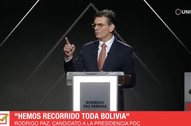 La Paz, 12 de octubre 2025. Durante el debate presidencial, Rodrigo Paz Pereira presentó sus medidas para un gobierno que rompa con la lógica del pasado de confrontación. “La primera gran medida: le dije basta…